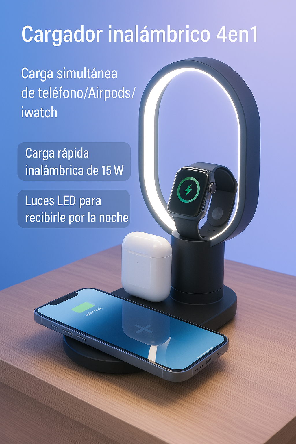 🔌 Base de Carga Inalámbrica 4 en 1 con Lámpara Nocturna – Práctica y Segura