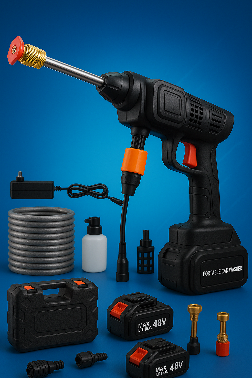 💦 Hidrolavadora Recargable Portátil (2 Baterías)La hidrolavadora portátil recargable es la herramienta ideal para mantener tu vehículo, moto, bicicleta, patios y fachadas impecables sin esfuerzo. Gracias a su diseño inalámbrico y sus 2 baterías de litio recargables, podrás limpiar con potencia y autonomía en cualquier lugar. Perfecta para quienes buscan practicidad, potencia y libertad de movimiento en sus rutinas de limpieza.⚡ Características Principales:✅ Diseño portátil e inalámbrico, ideal para usar en cualquier espacio.✅ 2 baterías recargables de 48 V, que aseguran mayor tiempo de uso continuo.✅ Alta presión de agua, elimina suciedad incrustada fácilmente.✅ Múltiples boquillas para diferentes tipos de chorro (fino, amplio, espuma).✅ Depósito de jabón incluido para lavados más profundos.✅ Manguera de succión que permite tomar agua directamente de baldes, tanques o ríos.✅ Estuche rígido de transporte, para mayor comodidad y protección.